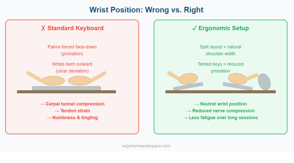 A standard flat keyboard forces your wrists into two unnatural positions simultaneously: pronation (palms facing down) and ulnar deviation (wrists angled outward toward your pinky fingers). Hold that position for 8 hours a day and you are compressing nerves, straining tendons, and setting the stage for carpal tunnel syndrome, tendonitis, or trigger finger.